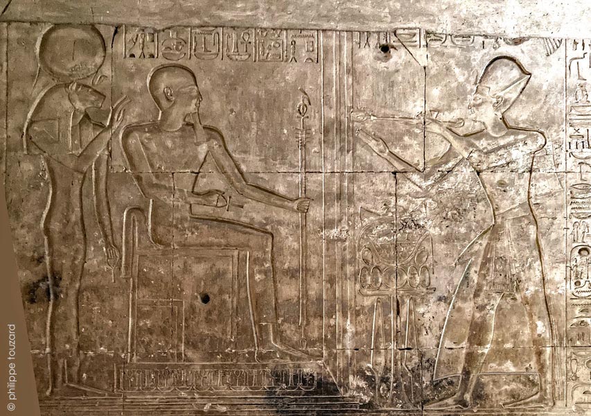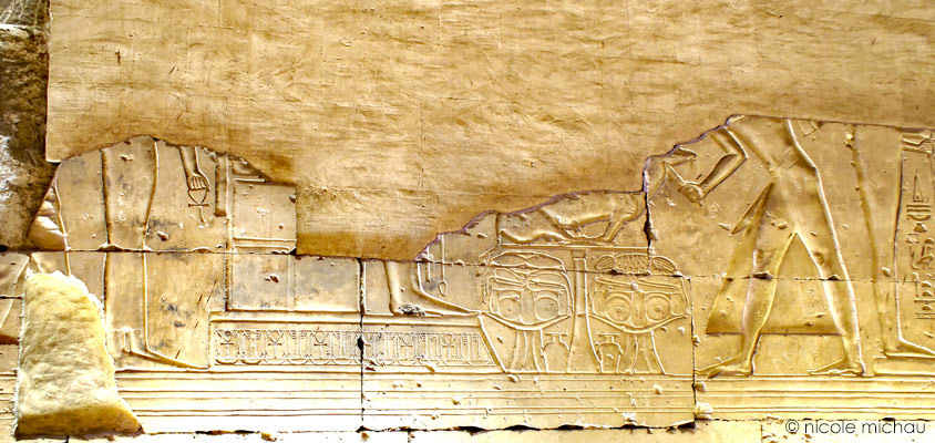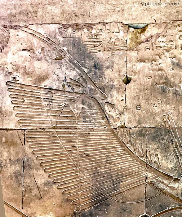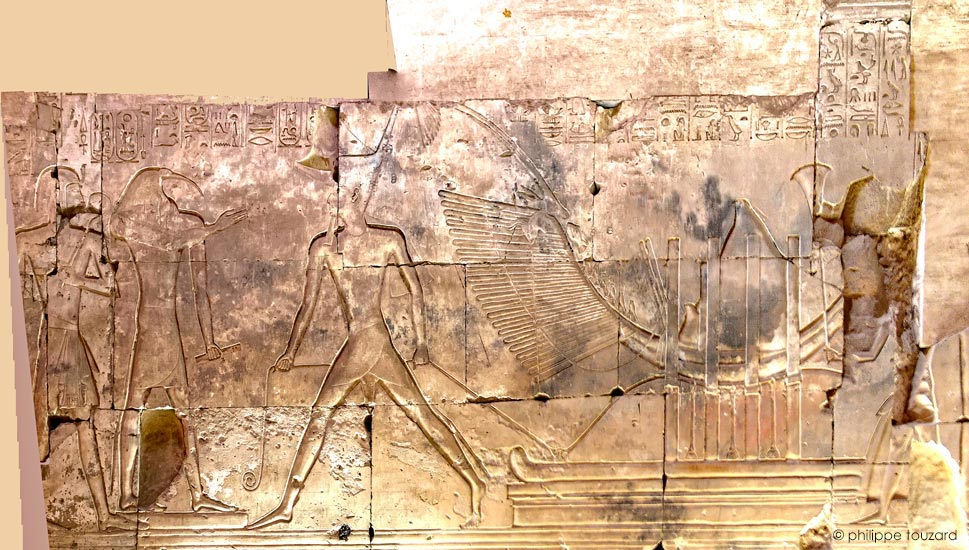 vers le dieu Thot et le roi Sethy 1er divinisé. Sur le traîneau, un faucon représentant Sokar.