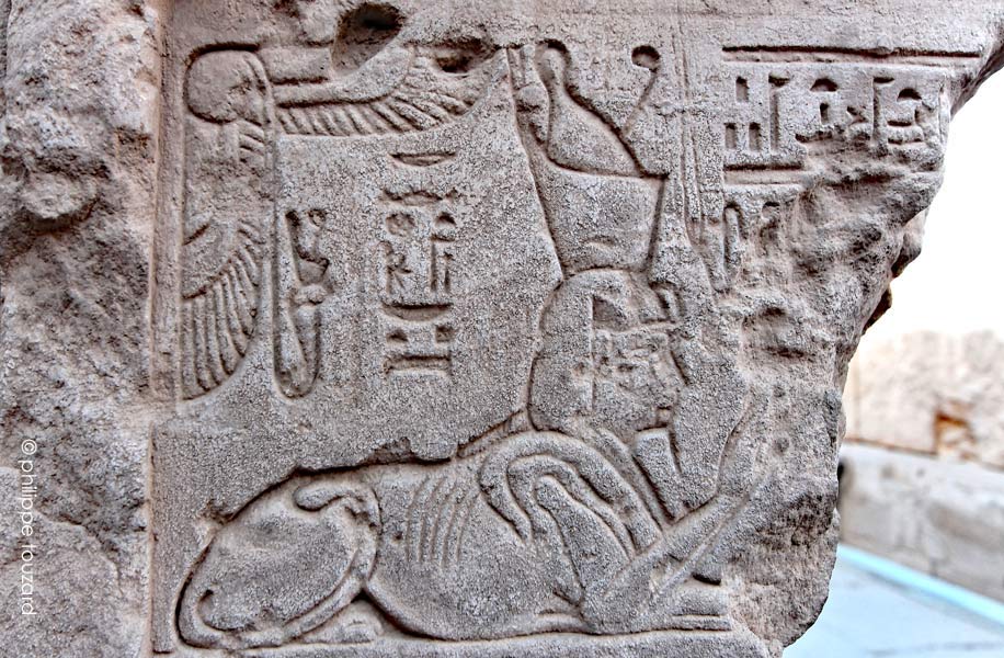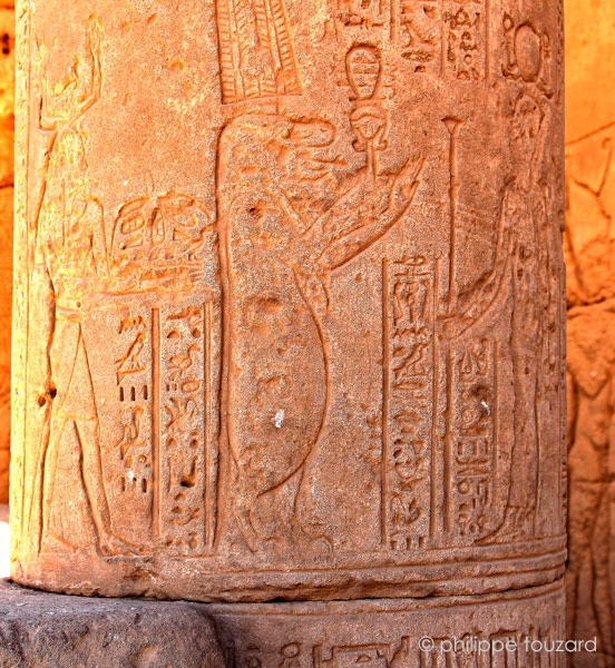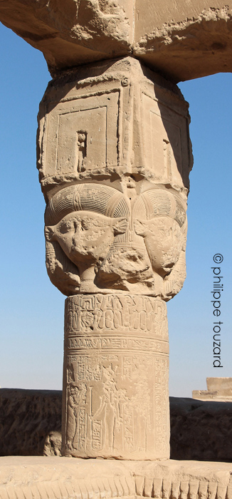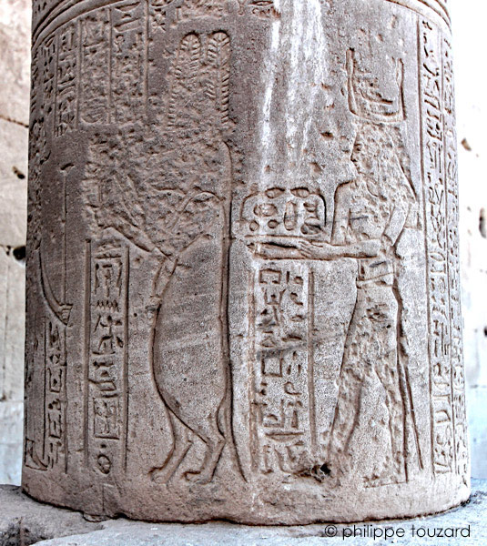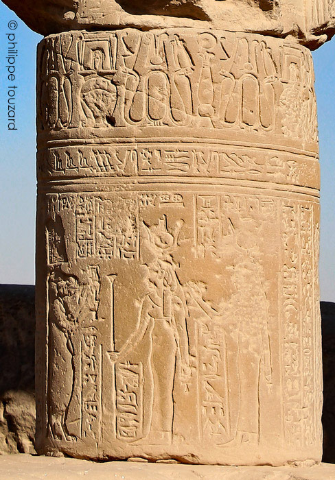 La déesse hippopotame Thoueris joue du sistre pour Hathor. Elle est suivie par le Ka royal.(Face tournée vers le Nord de la colonne F, Mariette planche 27b) Cette face représente le VIème mois de l'année