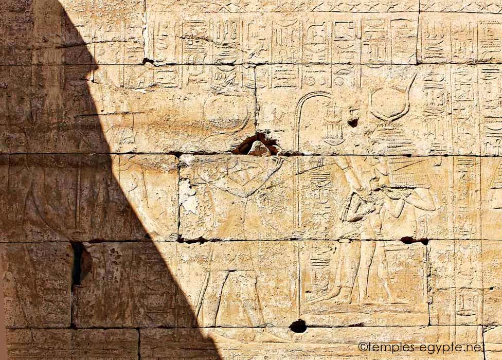 Hathor allaite elle-même son enfant. Devant elle, la déesse Sechat détermine ,le nombre de fêtes-Sed alloué au roi. La déesse Ouadjet apporte la couronne rouge qu'elle porte, au futur roi. À droite, Amon-Rê.