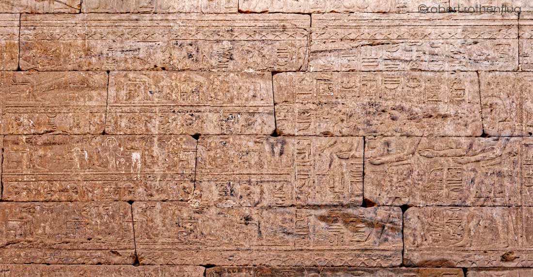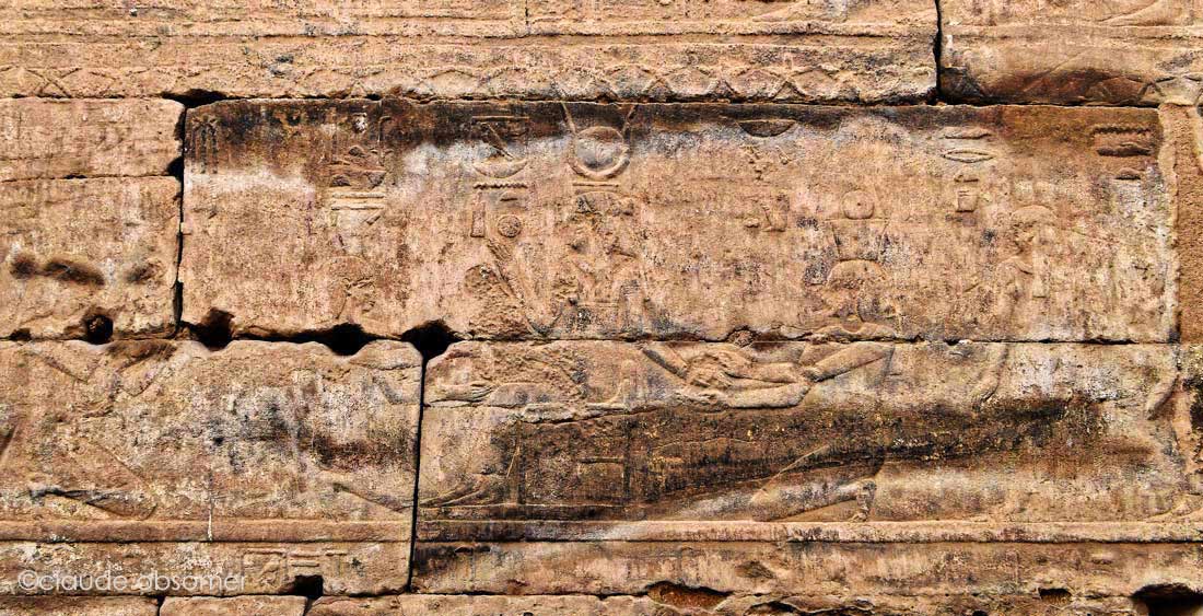 (santé, force, puissance et gloire) au nouveau-né. La frise est couverte des cartouches de Nectanebo.