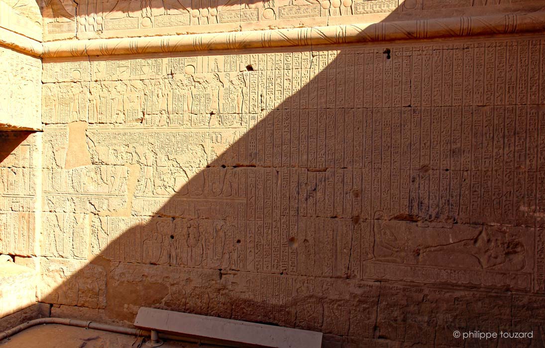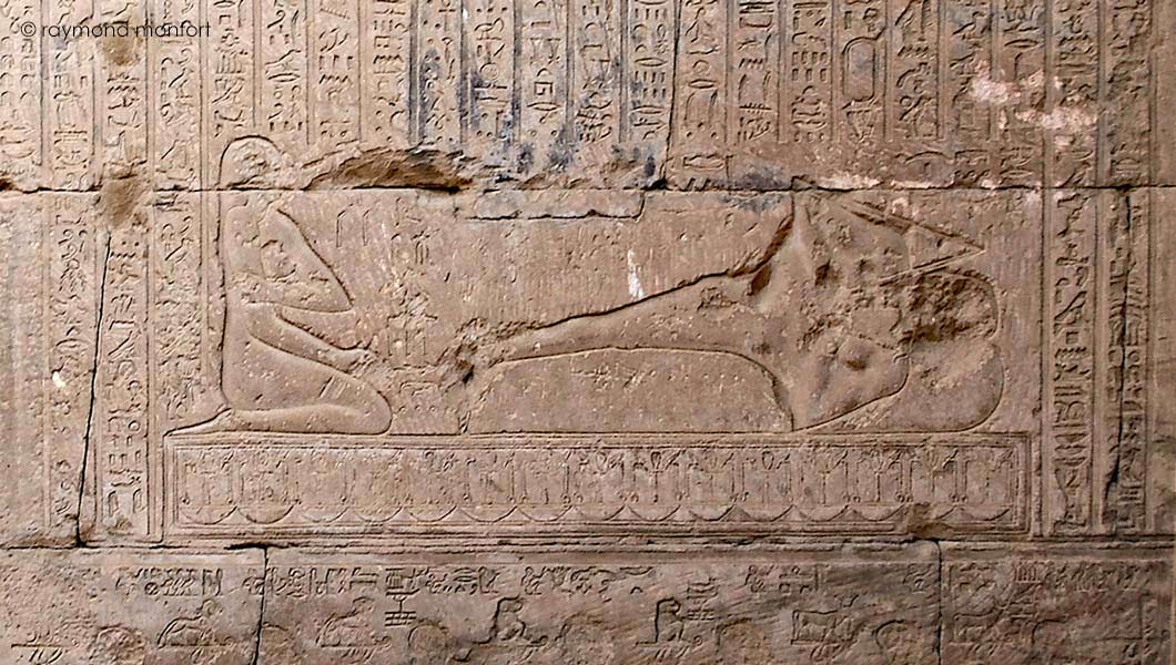 Sur le soubassement se poursuit le défilé des représentations des sites. À droite, en bas, le taureau est entravé. À gauche, en bas, la bête est présentée à Osiris, de Dendara sous son aspect abydénien, protégé par Isis et Harsiesis. Au second registre, le taureau est découpé en présence d'Osiris protégé par Hatmehyt , Dame de Mendès et OuretHekaou, déesse uræus. Sur le register du haut, est représenté la fin du défilé des dieux de linteau de la paroi Nord.