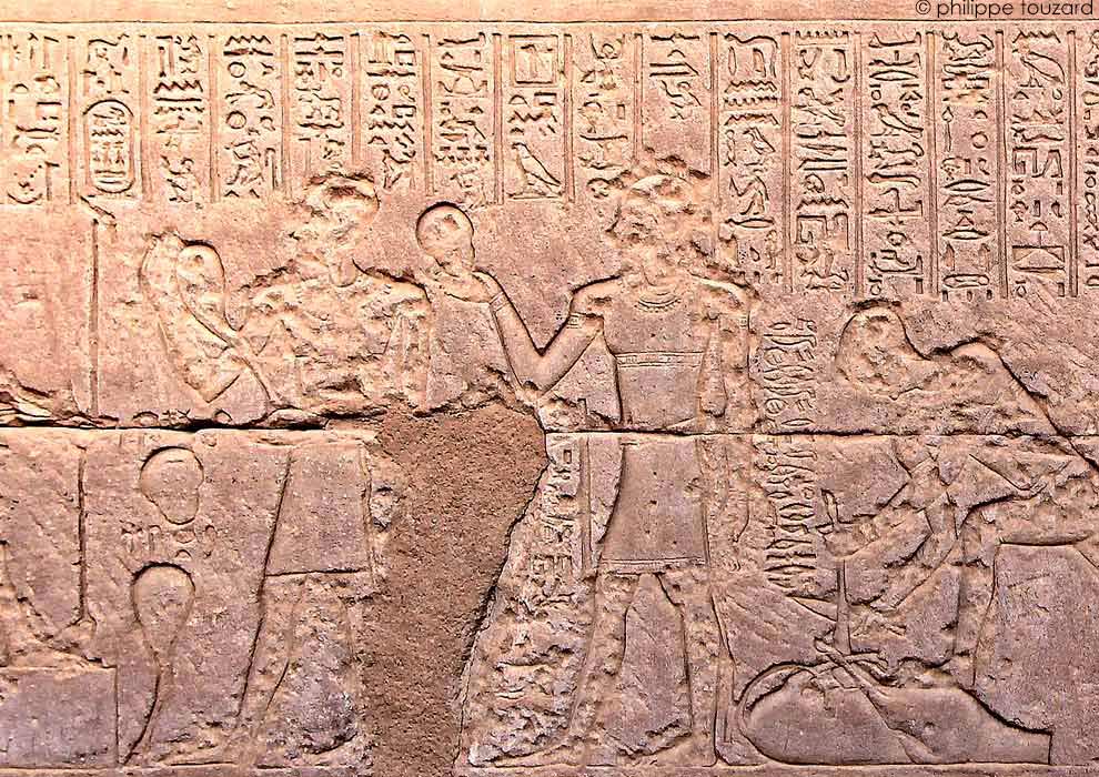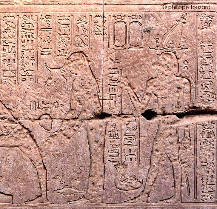 Le tableau décrit le rituel complet. les membres du taureau sont découpés. La cuisse et le cur sont présentés à Osiris. Une oie et un âne sont également sacrifiés (à droite, détail ci-dessous).