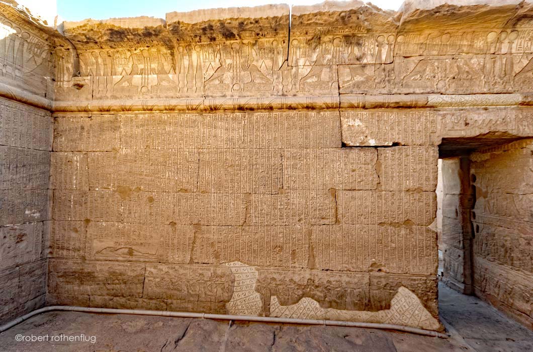 Les oiseaux-âmes (ou Bâ) d'Osiris qui décorent la frise portent des noms qui évoquent les lieux de culte d'Osiris, Busiris et Abydos.