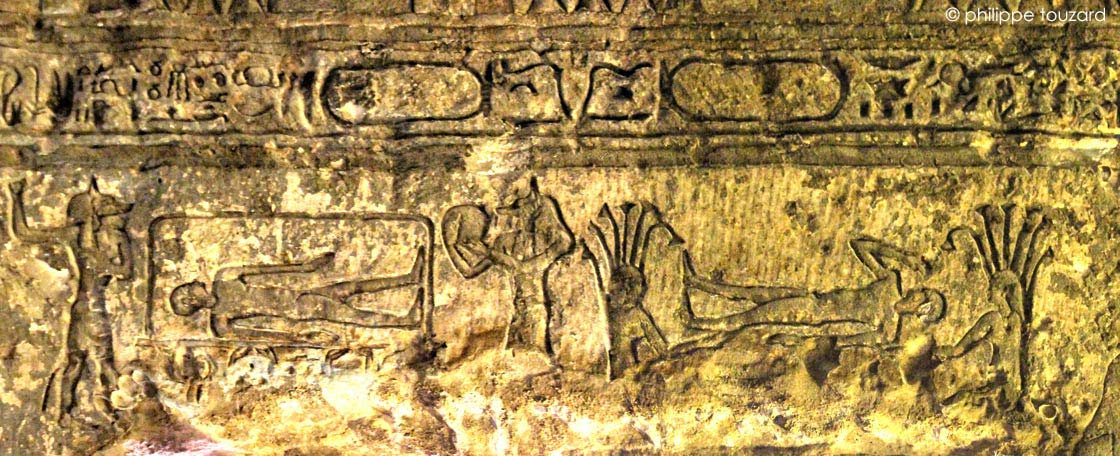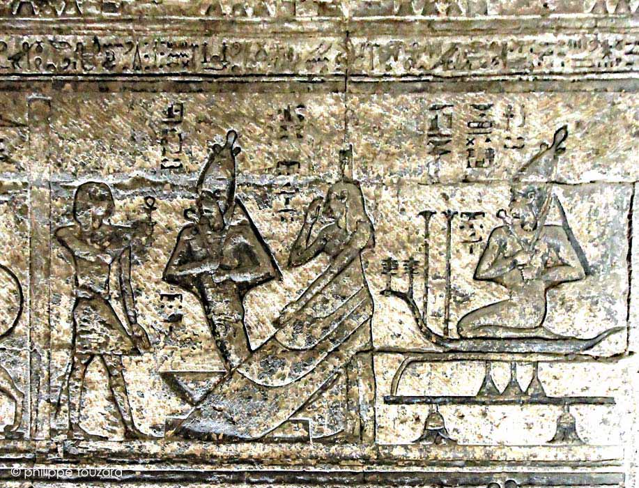 À droite, Osiris est agenouillé sur un lit avec des lotus et 2 piliers Djed à l'avant (Djedou?).