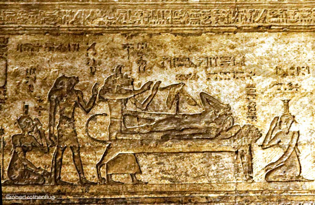 À gauche, le roi fumigène de l'encens (la vue est incomplète). Osiris de Dendara est momifié par Anubis. Son héritier est représenté 2 fois : en faucon et comme Harsiésis, dieu à tête de faucon. Les pleureuses sont Chentayt à gauche et Merkhetès à droite.