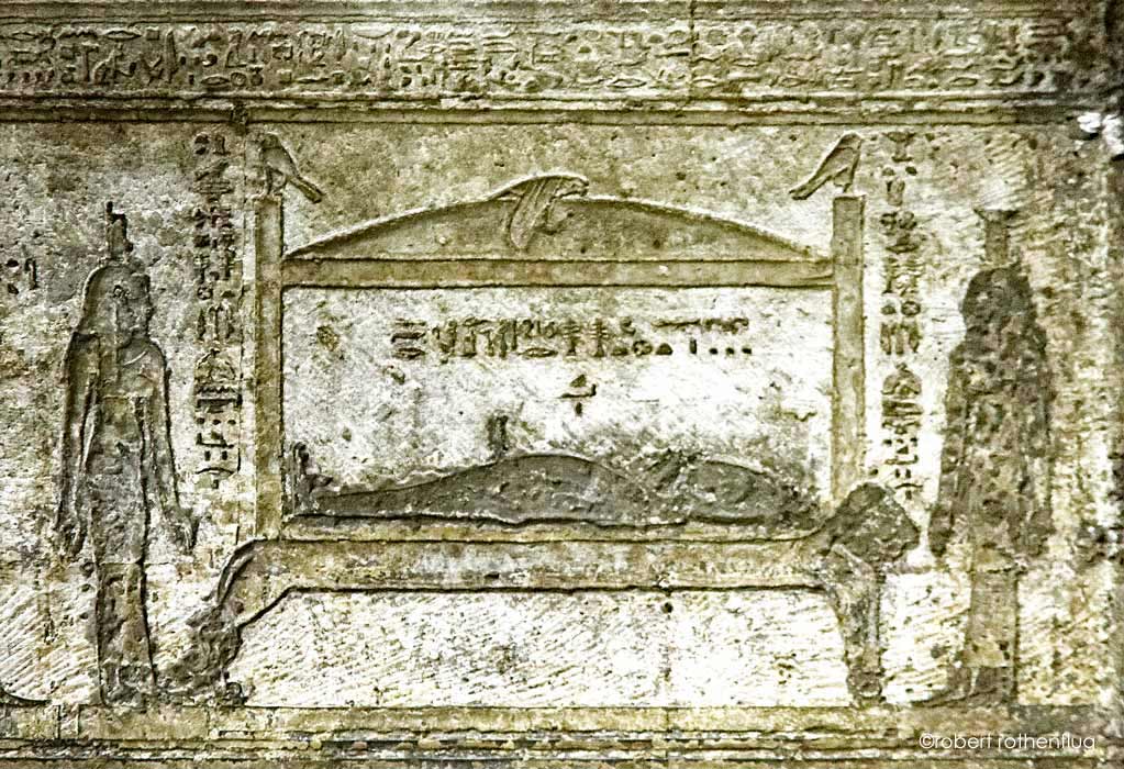 Sur le linteau, au dessus de la porte, deux scènes ont été gravées sans texte. À gauche, Osiris dans un sarcophage est entouré de deux Anubis, l'un se frappant la poitrine en signe de lamentation et l'autre jouant du tambour.