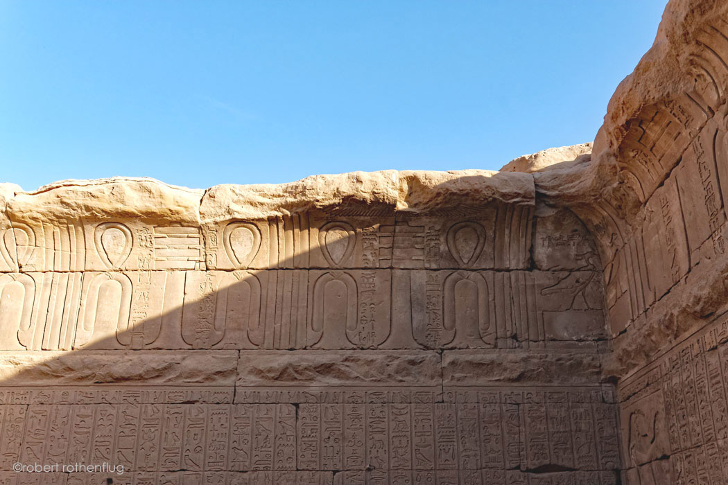 La frise représente le pilier-djed entouré de nœuds d'Isis, motif répété 4 fois sur la paroi Est. Les textes traitent d'Osiris enseveli à Dendera, d'Isis avec Thot et Nephtys et d'Osiris ressuscité avec Orion.. Ces textes étaient lus en faisant alterner les textes Est et les textes Ouest. Les 2 phénix, Est et Sud se suivent, tournés tous les 2 vers la porte.