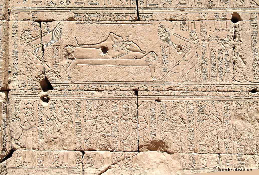 Osiris momifié repose sur un lit aux attributs de lion, lit protégé par deux Khouy, déesses aux ailes déployées accrochées à leur bras et tendant la plume de protection. Sur la paroi .Est, Isis et Nephtys jouent ce rôle tendis que le roi fumigène de l'encens. Isis est héliopolitaine et busirite, tandis que Nephtys est la nourrice de l'héritier et la gardienne du corps.