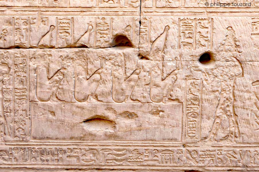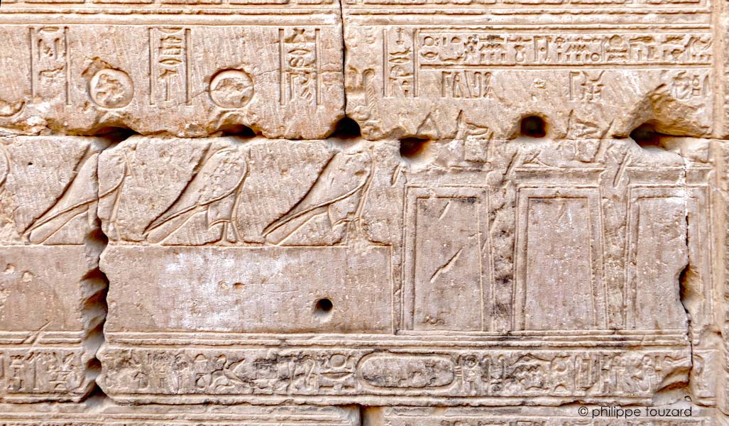 Compte-tenu de la dégradation de la paroi à cet endroit, seules subsistent 3 représentations des 7 divinités figurées comme des oiseaux à tête humaine ou animale. Ce sont les enfants de Tanen enterrés à Memphis, dieux de l'écriture souvent liés à un contexte de glorification.