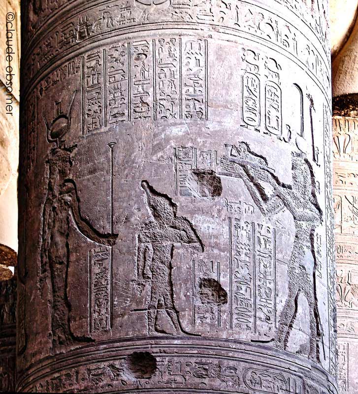 le roi (Claude) présente les Deux Maîtresse à Hathor. La déesse est la seule à figurer sur les tableaux latéraux.