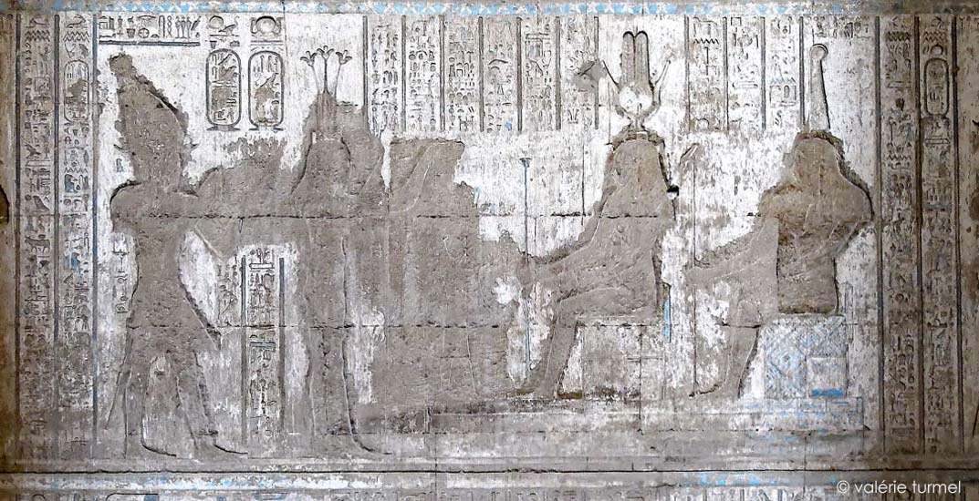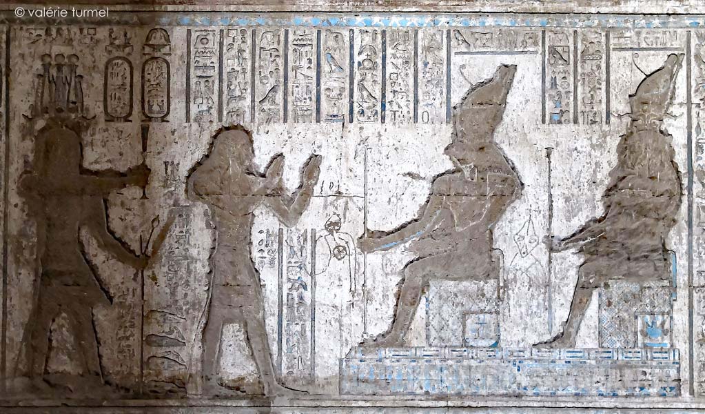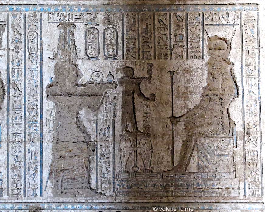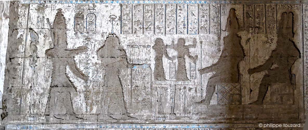 Les Meret sont les intermédiaires musiciennes entre le roi et Hathor-Isis accompagnée de Chou. Le roi offre un clepsydre.. Chou fils de Rê a ramené l'uræus-lionne pacifié qui s'était enfui en Nubie.