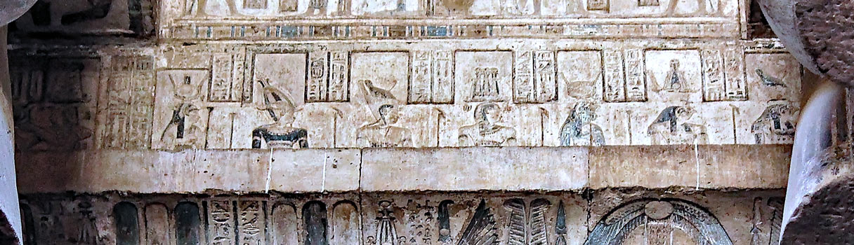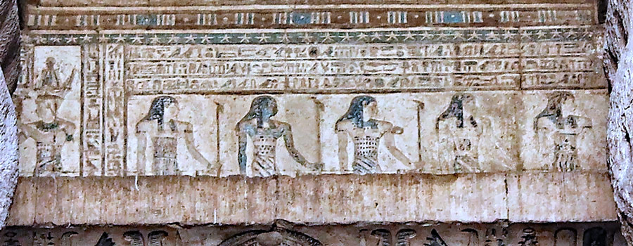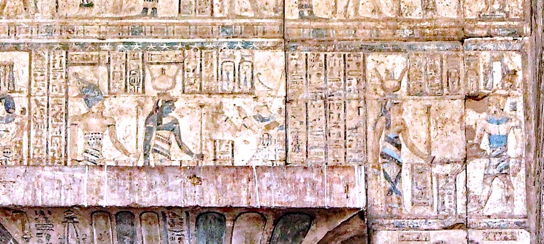 Scène IV : le panthéon d'Edfou se compose de 12 dieux dont 7 sont visibles en partie ci-dessus. Dans le temple de Dendera, il est garant de la fécondité et du bien-être du lieu. Il est représenté également dans le sanctuaire et dans l'angle Ouest du temple. La scène V est manquante.