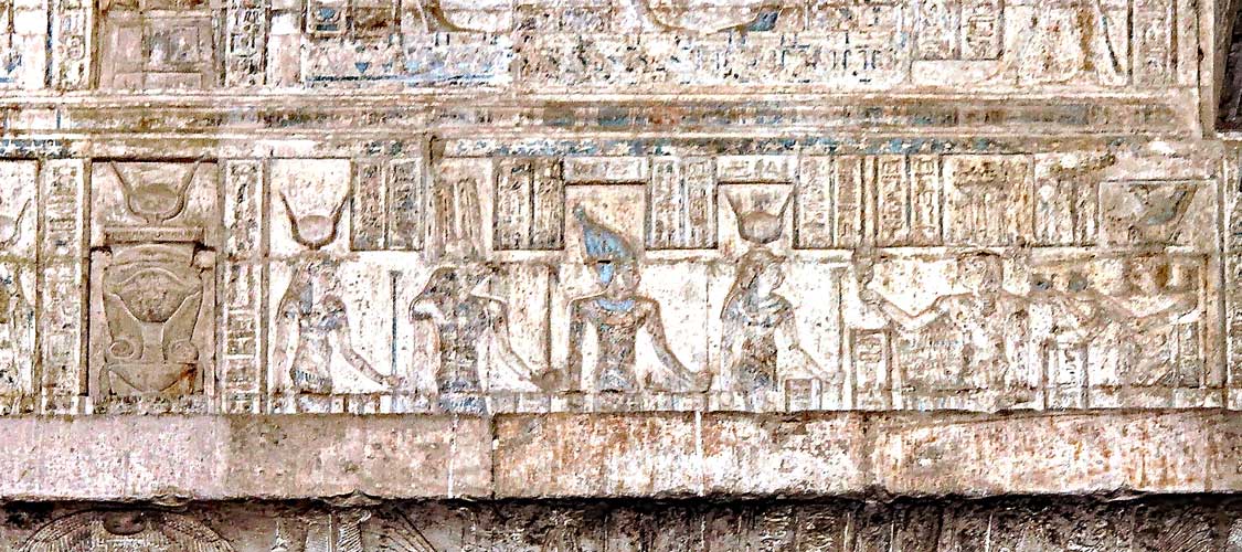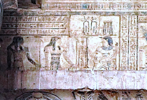 Scène VI : le roi présente du vin à Isis Hathor devant laquelle un dieu enfant joue du sistre. Isis n'est présente dans ces scènes que sous l'aspect de dauphine. Isis, la régent qui régit les 4 directions précède Osiris, Harsomtous à tête de faucon, Hathor, le collier-menit dans le temple du collier-meniy.