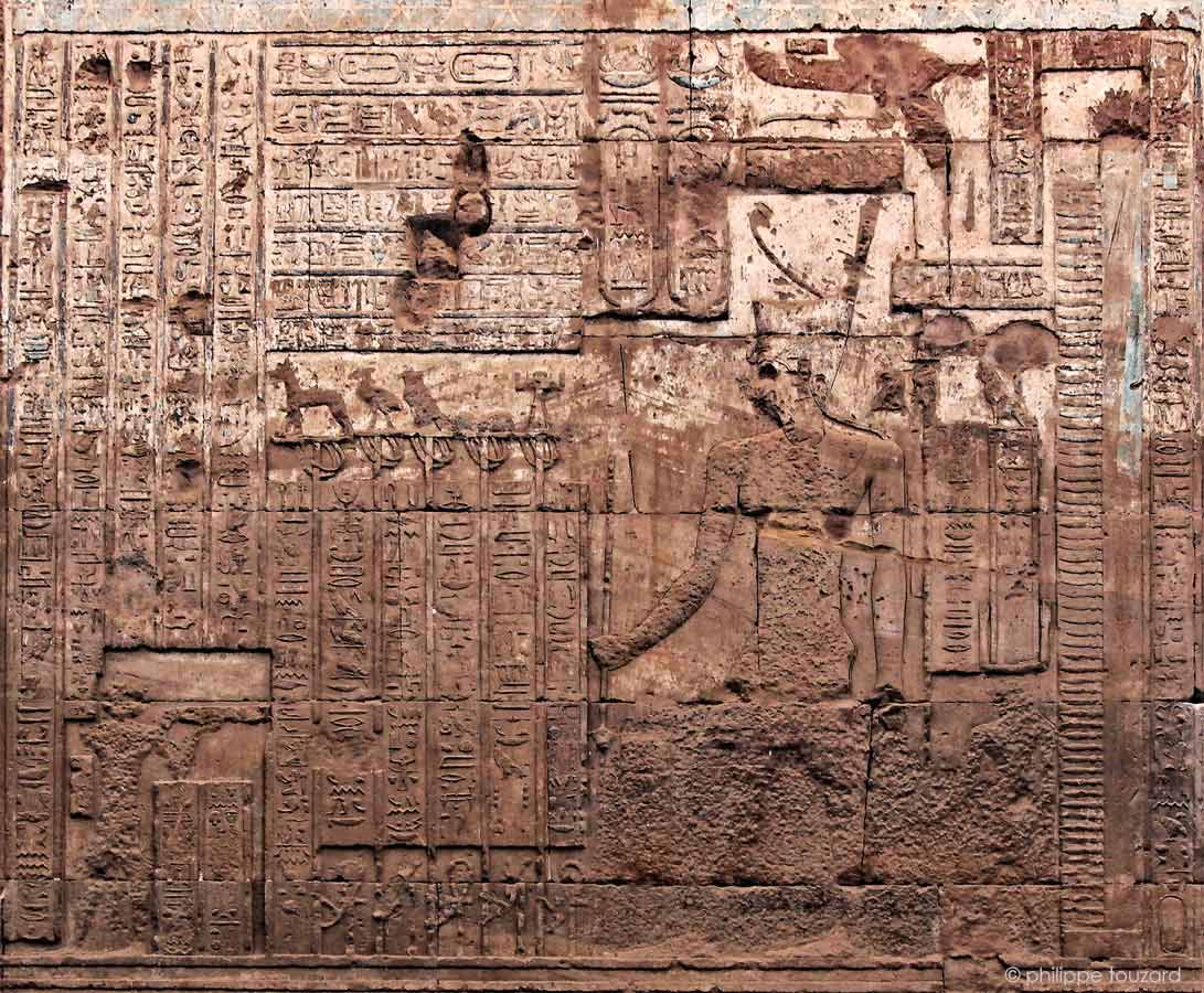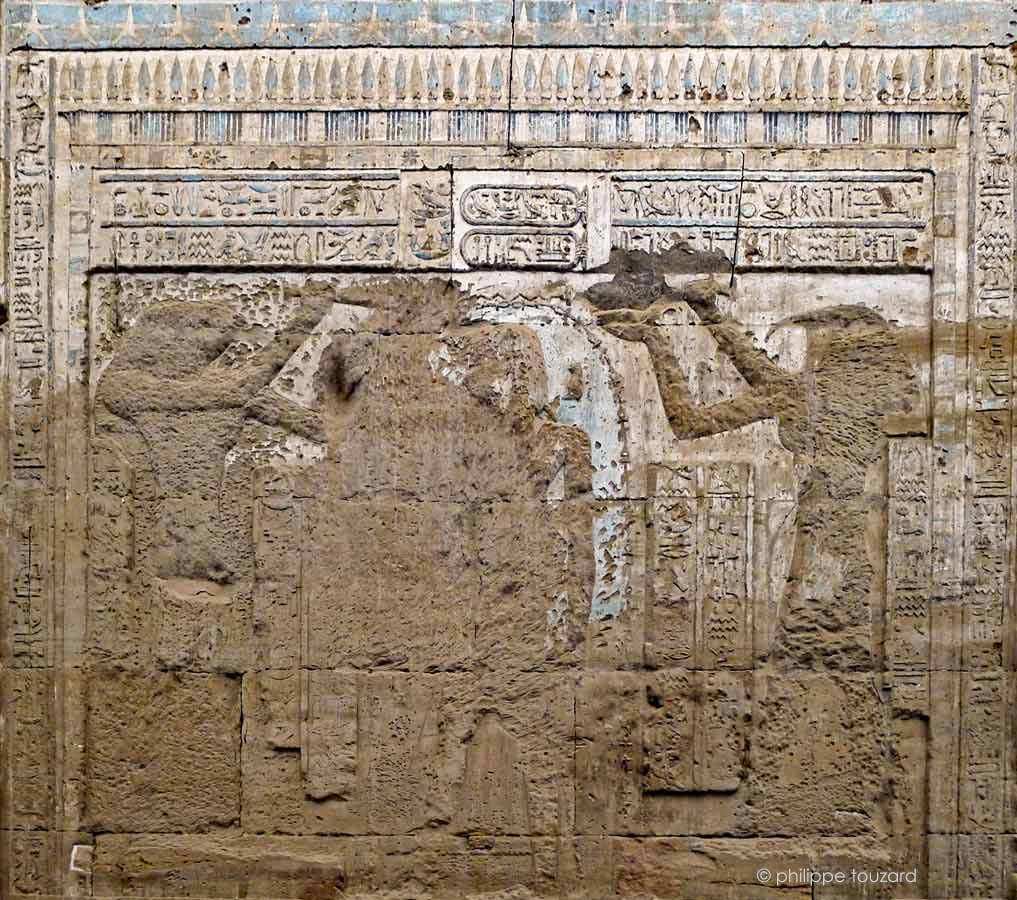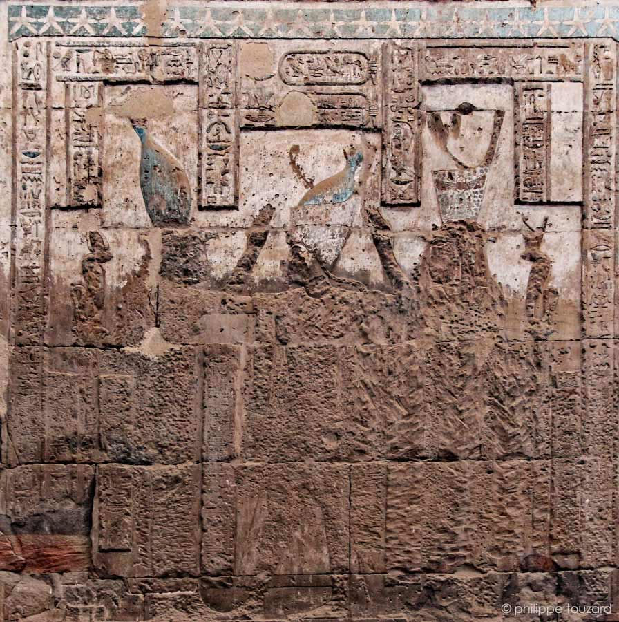 Sans cette scène, le roi de Basse Egypte suivi de son ka sort de son palais pour entrer dans le temple. Le roi est précédé par des emblèmes posés sur des pavois : Oupouaout, Thot, Horus et le placenta royal. Le dernier pavois porte l'emblème de la ville, Iatdi, souveraine des villes, Devant le roi, Iounmoutef fumigéne de l'encens.