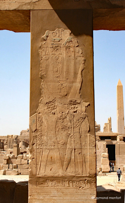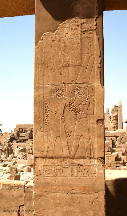 Le pilier suivant semble être positionné au bout des piliers Ouest. Amon-Rê donne une accolade à Thoutmosis III.