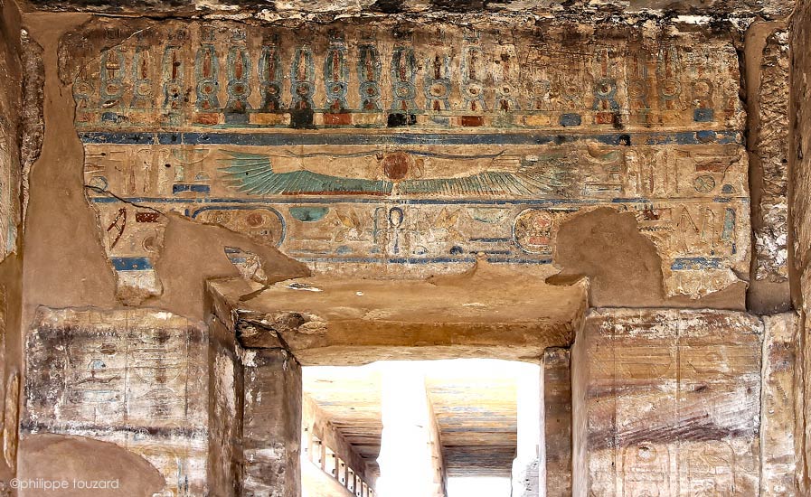 La porte comporte plusieurs niveaux de décoration. En haut, une frise. En dessous, celui de Behedet, le dieu grand. Ensuit, une partie de la titulature du roi, dit "Aimé d'Amon-Rê", en 2 inscriptions symétriques. Enfin, d'autres parties de la titulature de chaque côté de la porte.