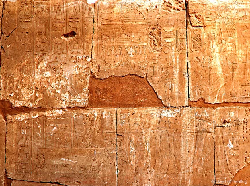 Thoutmosis III encense Mout et lui verse une libation, 2 actes de purification des offrandes qui se trouvent entre eux. Le roi reçoit de Mout de nombreux dons : toute vie, tout pouvoir, toute stabilité, toute santé et des millions d'années sur le trône d'Horus