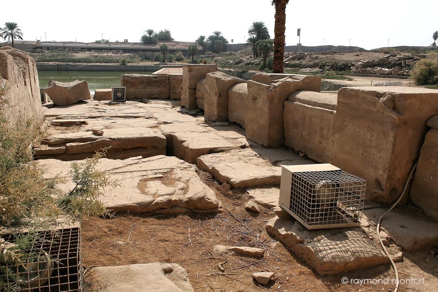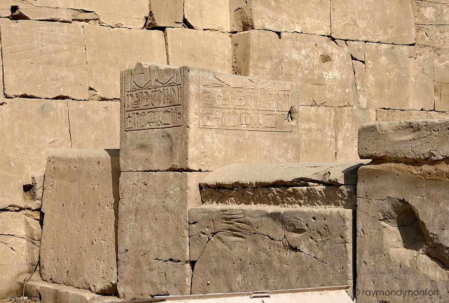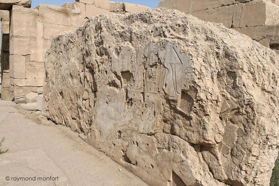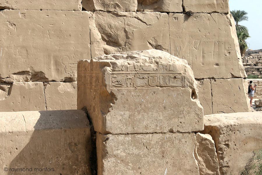 Cette vue montre le mur extérieur Est de la 2e cour entre le VIIe et le VIIIe pylône. On remarque à droite une construction qui est une chapelle reposoir construite sous Thoutmosis III. L'entrée se trouve sur la 2e cour.