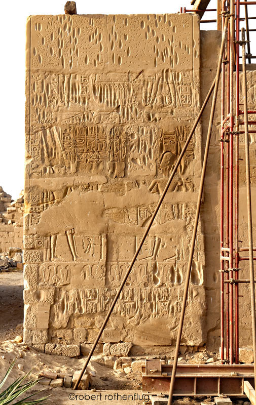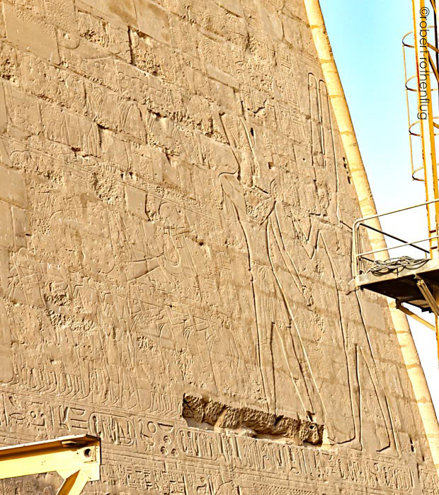 Différentes scènes d'offrandes occupent également le bas du pylône À droite, accompagné par Thot, le roi offre un bouquet à Amon est représenté avec une tête de bélier et suivi de Mout. À gauche, le roi fait une offrande à Amon et Amonet.