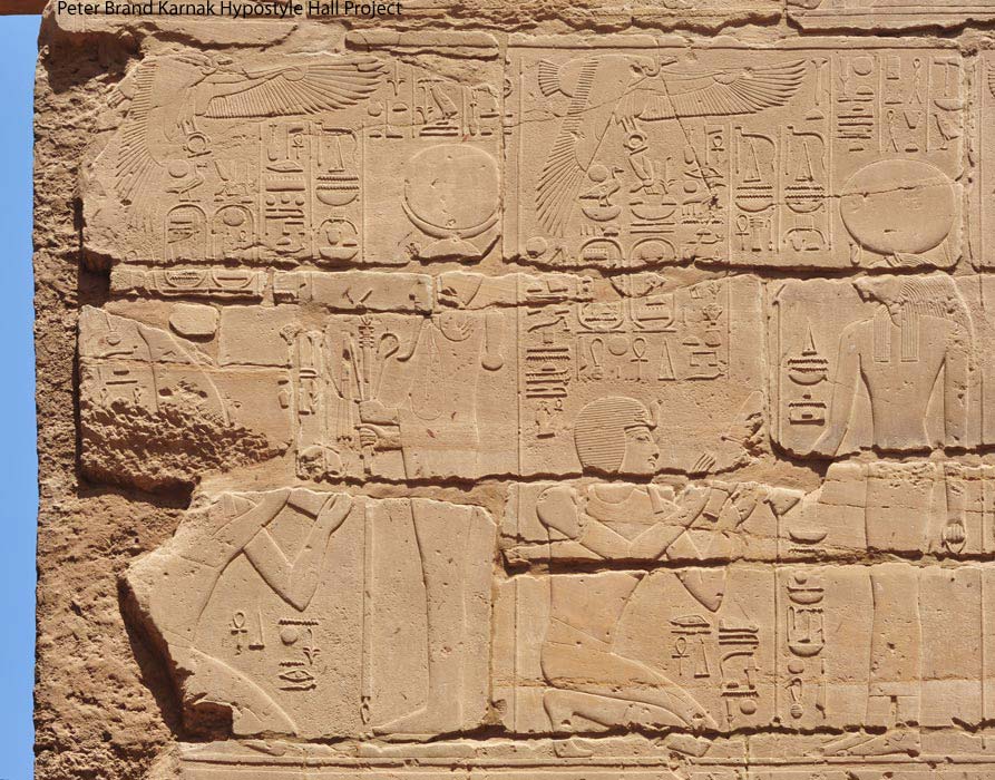 Scène 208 (droite) : Sethy 1er agenouillé présente un vase d'onguent à Sekhmet aimée de Ptah. Ouadjet vole au-dessus de la scène. Sekhmet lui donne notamment toute bravoure, victoire et toute santé comme Rê.