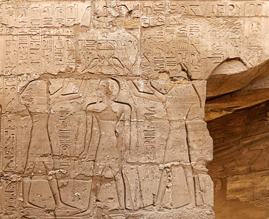 Scène 106 à gauche : Hathor amène le roi vers Amon et Amonet. Hathor porte les grandes plumes et joue du sistre. Le vautour Nekhbet vole au dessus de la scène. Hathor présente le roi à Amon qui lui donne notamment sa propre durée de vie en tant que roi. Amonet lui promet des millions de jubilés.