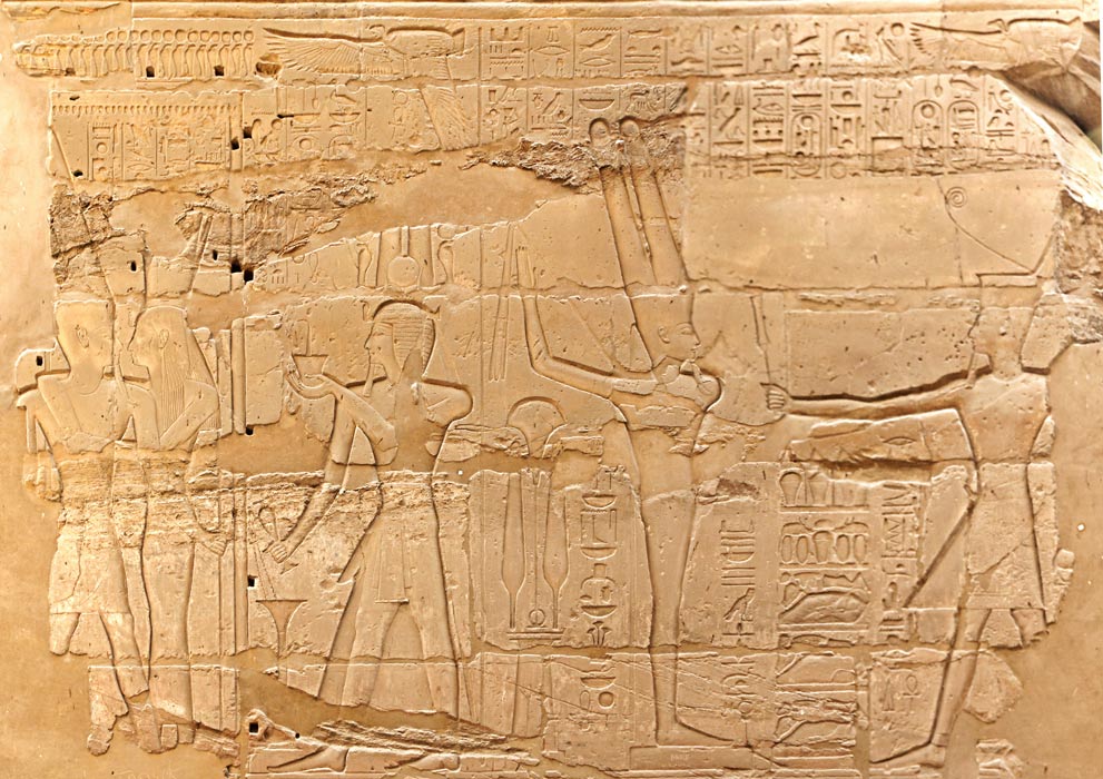 Scène 107 à gauche : le roi encense et verse une libation devant un kiosque dans lequel Amon-Rê est embrassée par Mout. Amon est le premier dans Karnak et roi des dieux.