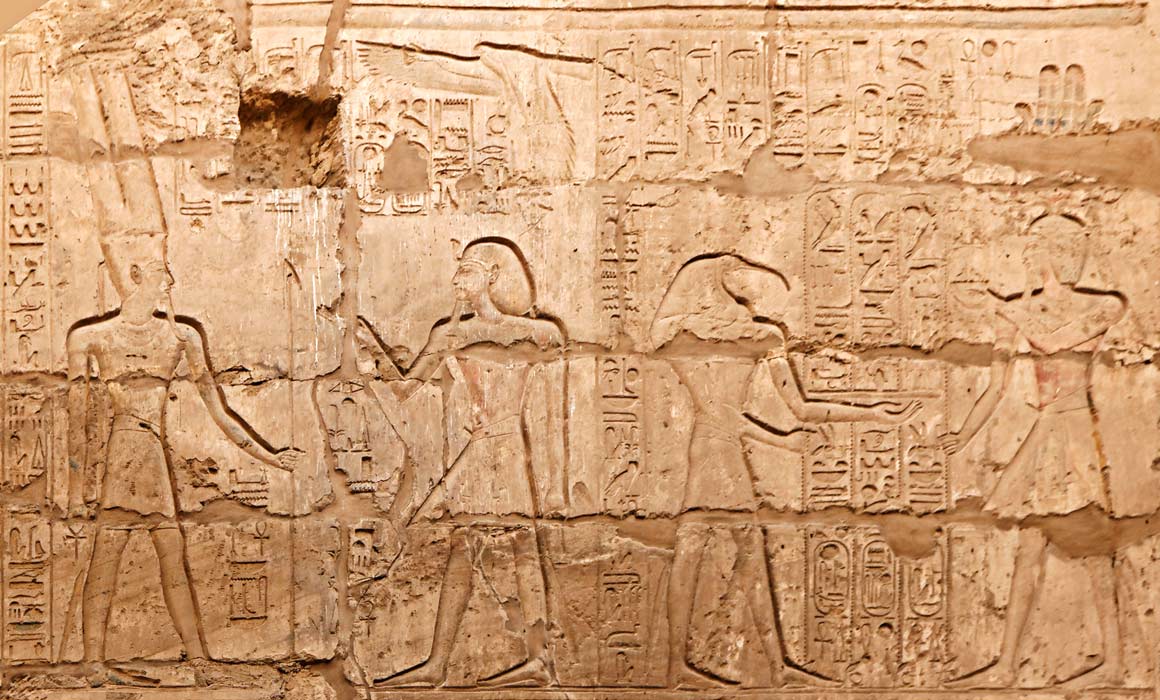 Scène 100 : le ro se tient en adoration devant Khonsou dans Thèbes Neferhotep à Karnak. Le dieu lui donne toute victoire, toute joie et les années d'éternité.