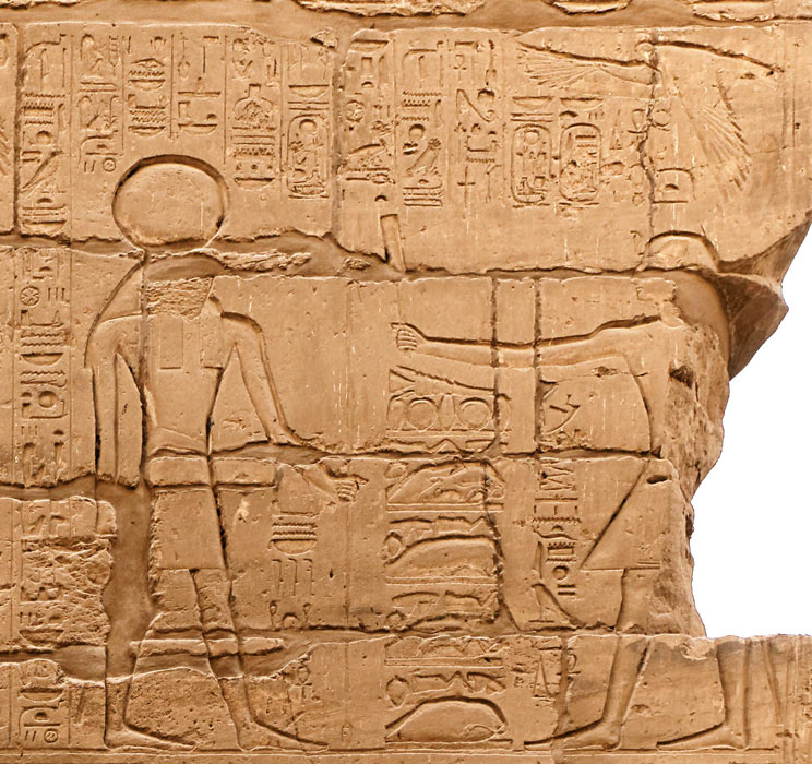 Scène 101 : Ramsès II bénit avec son sceptre un monceau de victuailles dans lequel prédomine de la viande; Le dieu représenté est Amon-Rê-Horakhty-Atoum maître de Karnak. qui lui donne sa durée de vie en tant que roi pour toujours, ses victoires, sa puissance et les années d'éternité.