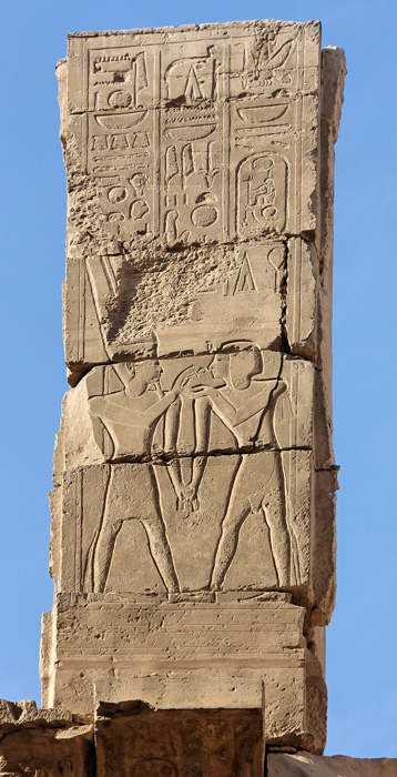 Les colonnes latérales ont été construites avec une différence de hauteur par rapport aux colonnes centrales. Colonnes latérales et colonnes centrales portaient des plafonds à des hauteurs différentes. Sur les colonnes latérales parallèles aux colonnes centrales, la paroi était percée des ces fenêtres ou claustra dont on voit un exemple ici. Ces fenêtres constituaient les seules ouvertures par lesquelles la lumière entrait dans la salle hypostyle. Les plafonds recouvraient toute la salle, les portes étaient fermées. Il faut imaginer la pénombre qui y régnait, pénombre indispensable pour les rituels. Chaque fenêtre était bordée par des titres royaux ou par des scènes d'offrandes aux dieux, scène que l'on aperçoit à droite de la fenêtre et dont un exemple est donnée ci-dessous.
