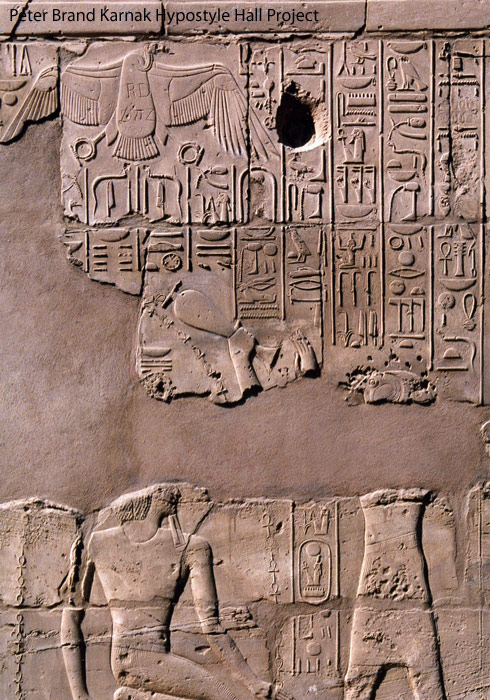 Scène 199 : le roi Sethy 1er est conduit vers le temple par Montou et Atoum. Devant, la déesse Hathor de Dendera le congratule. A l'avant, sur les deux pavois, Oupouaout, l'ouvreur des chemins et le placenta royal toujours représentés dans ce type de scène.