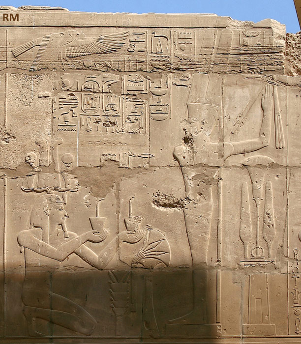 Scène 172: le roi Sethy 1er agenouillé offre des fleurs et de la nourriture à Amon-Rê. Le dieu lui donne toute vie, stabilité et pouvoir, la joie de Rê et la victoire. En haut, à gauche, Nekhbet.
