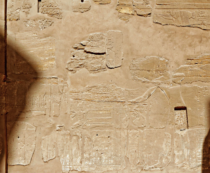 Scène 159 : précédé par 3 rangées de prêtres portant des pavois, Sethy 1er escorte une statue d'Amon-Rê ithyphallique. Suivent 2 grandes représentations d'Amon-Rê Kamoutef représenté ithyphallique et d'Amonet. La grande représentation d'Amon donne plusieurs bienfaits au roi, dont tous les pays rassemblés ensemble. Derrière Amon, la formule de protection; Amonet lui donne toute nourriture.