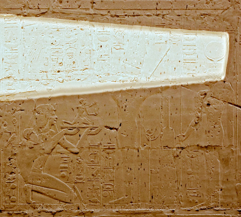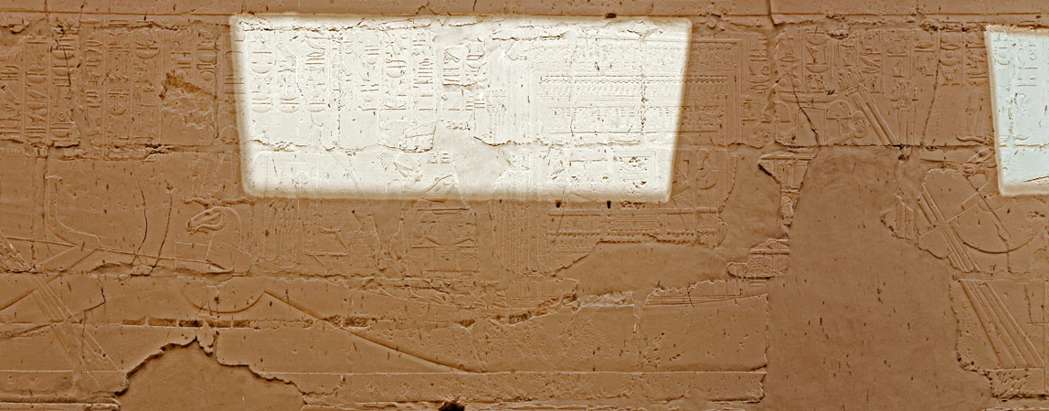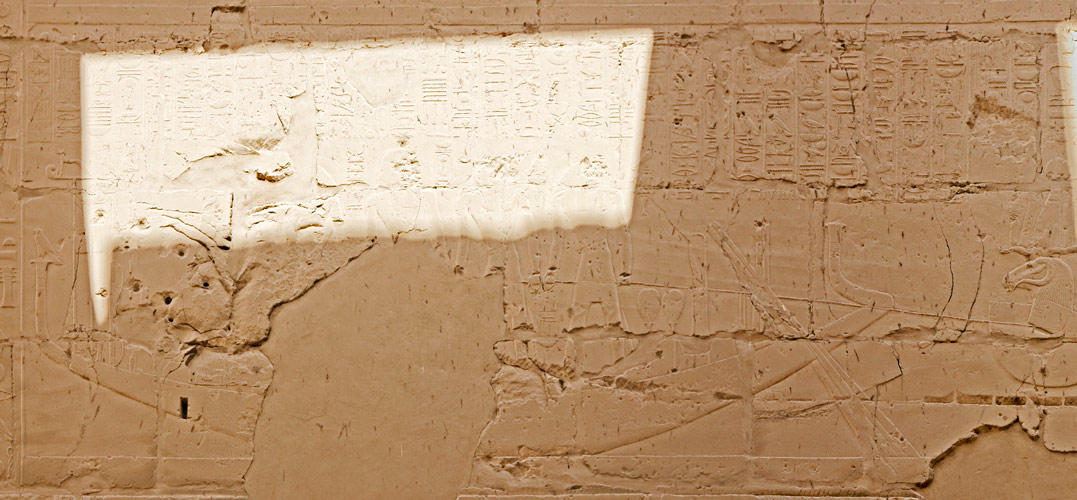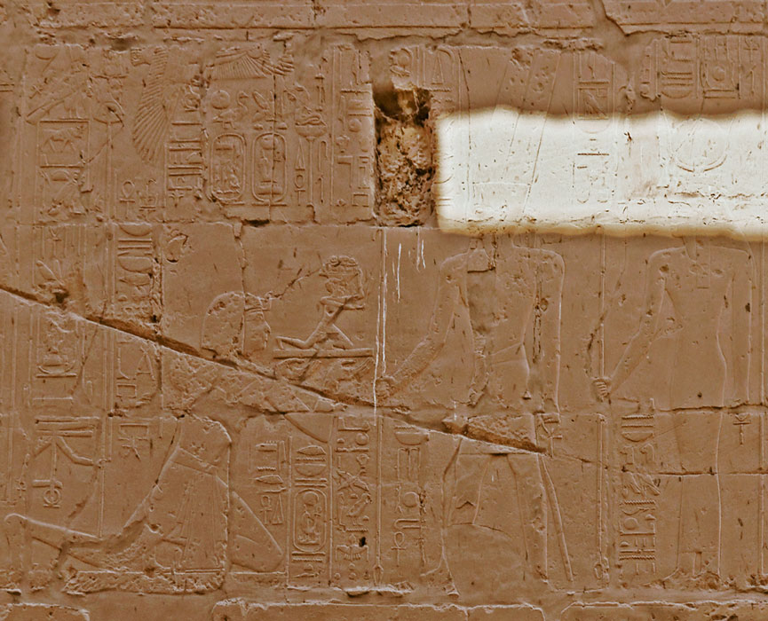 Scène 151 : Sethy 1er forme un équipage avec Oupouaout, Khnoum et Horus pour tirer la barque d'Amon (voir la scène suivante). Le roi est accompagné de la déesse Meret du Sud qui donne le rythme. C'esu déesse musicienne rituelle personnifiant le chant cérémoniel. Lorsque la célébration du rite s'accompagne de chants, elle donne le rythme en claquant des mains (Corteggiani, 2007)