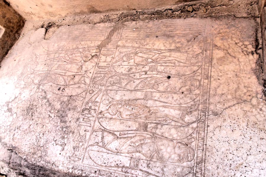 Une plaque d' albâtre sur laquelle sont représentés les Neuf Arcs, c'est-à-dire les vassaux de l' Égypte en constitue le sol. Sans doute cet édifice servait d'emplacement pour le trône du roi