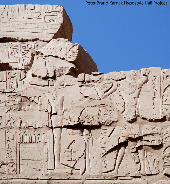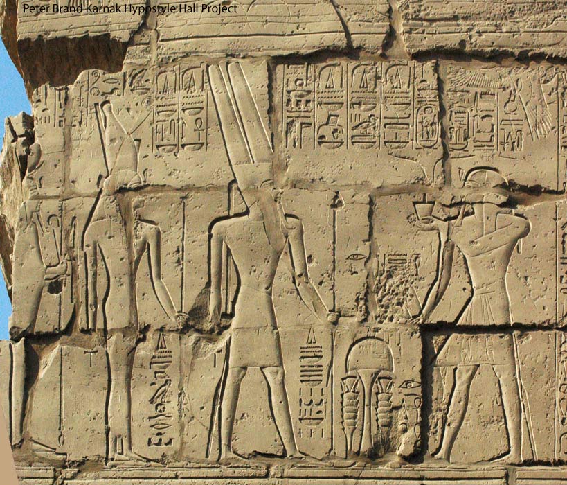 Scène 12a : le roi Ramsès II court devant Ouret-Hékaou. Il tient dans une main un ibis et dans l'autre des massues. La déesse lui promet l'éternité comme roi des Deux Terres, des myriades d'années et les jubilés comme Rê.