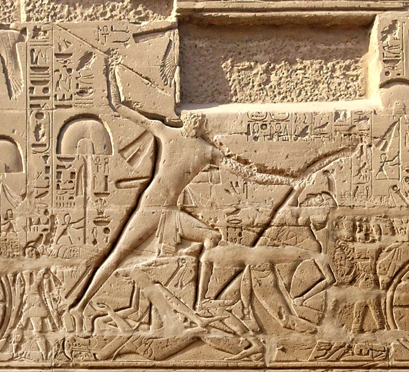 Scène 15 : le roi Sethy 1er s'apprête à frapper avec sa lance un chef libyen déjà touché par une de ses flèches. (OIP107, planche 29)