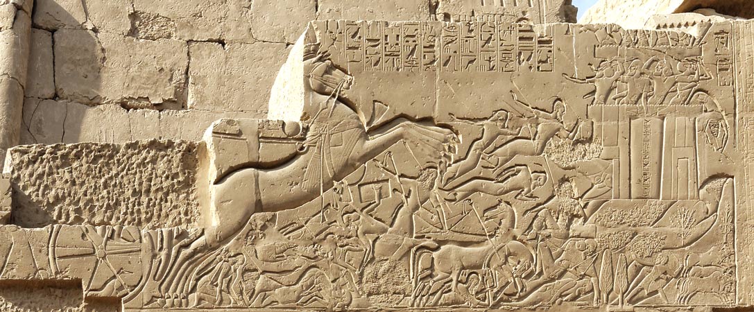 Scène 18 : le roi est en campagne contre le pays de Qadesh. Le nom de la ville et du pays sont écrtits sur la forteresse. La ville est défendue par des Syrines. Les ennemis sont criblés de flèches par le roi dont la représentation a disparu. Dans le coin droit de la scène, un bouvier fuit avec son bétail (cliquez dessus pour des détails).
