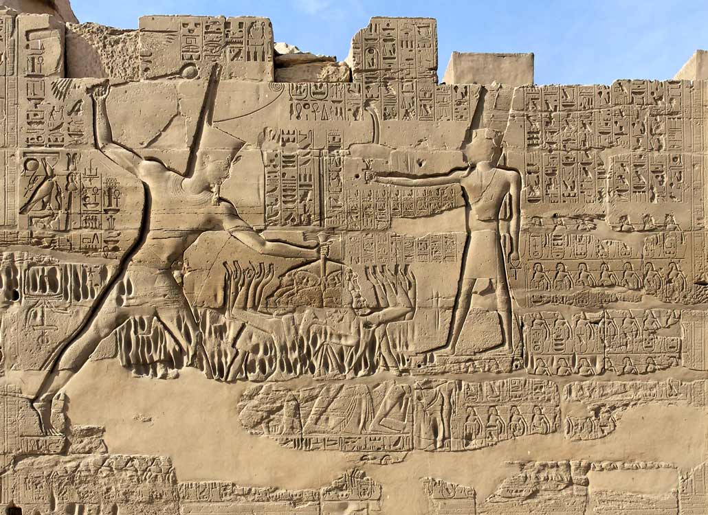Le roi porte la couronne rouge et une jupe à laquelle la traditionnelle queue de taureau est attachée. Il est suivi de son ka portant le nom d'Horus. Les ennemis représentés sous sa main sont un Lybien, un Nubien et des asiatiques. En face de lui, Amon-Rê tend le cimeterre khepesh considéré comme le symbole de la force royale. En dessous d'Amon, la déesse Thebes tient dans ses mains les cordes liant les prisonniers.