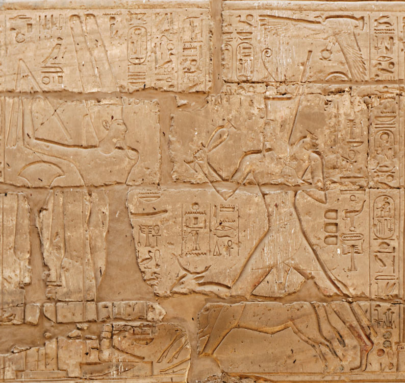 Scène 68 : le roi Ramsès II tient 4 veaux par des longes attachées aux pattes avant. Les 4