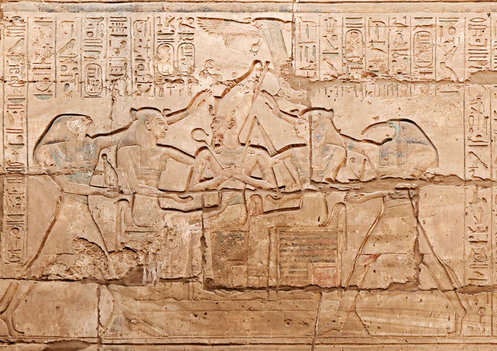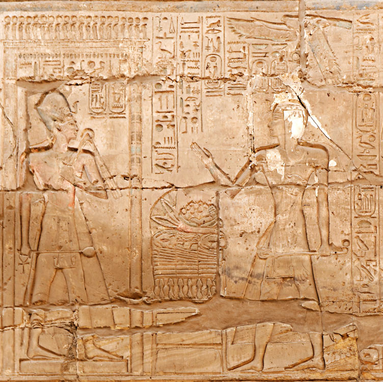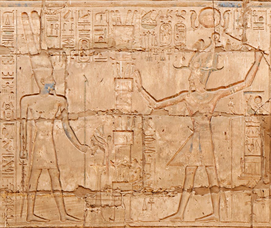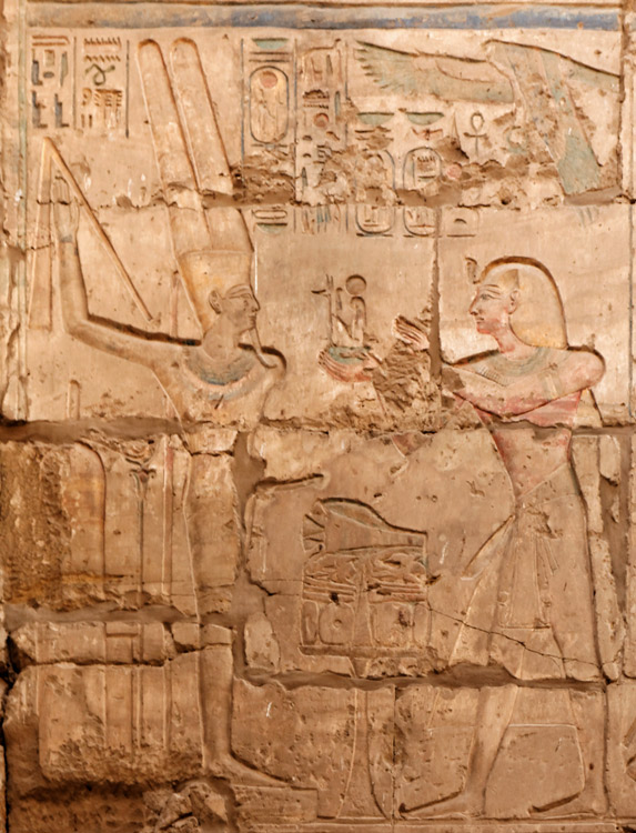 Scène 73 : ce rite est dit des 4 coffres-meret. Dans ce rite, le roi (ici Ramsès II) consacre les 4 coffres dans une posture toujours identique. Il est devant Amon-Rê dont la représentation conserve encore la belle couleur bleue du visage. Le dieu lui promet notamment les 9 arcs sous ses sandales.(pour plus d'informations, cliquez ici)