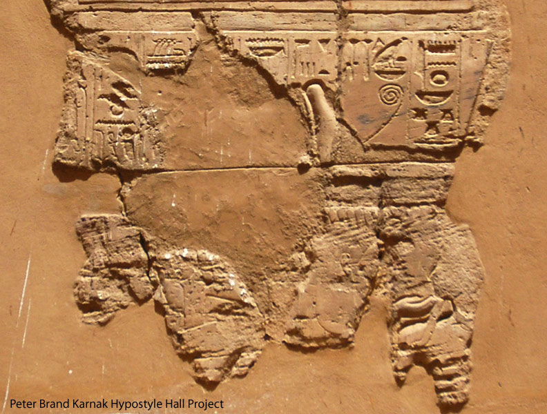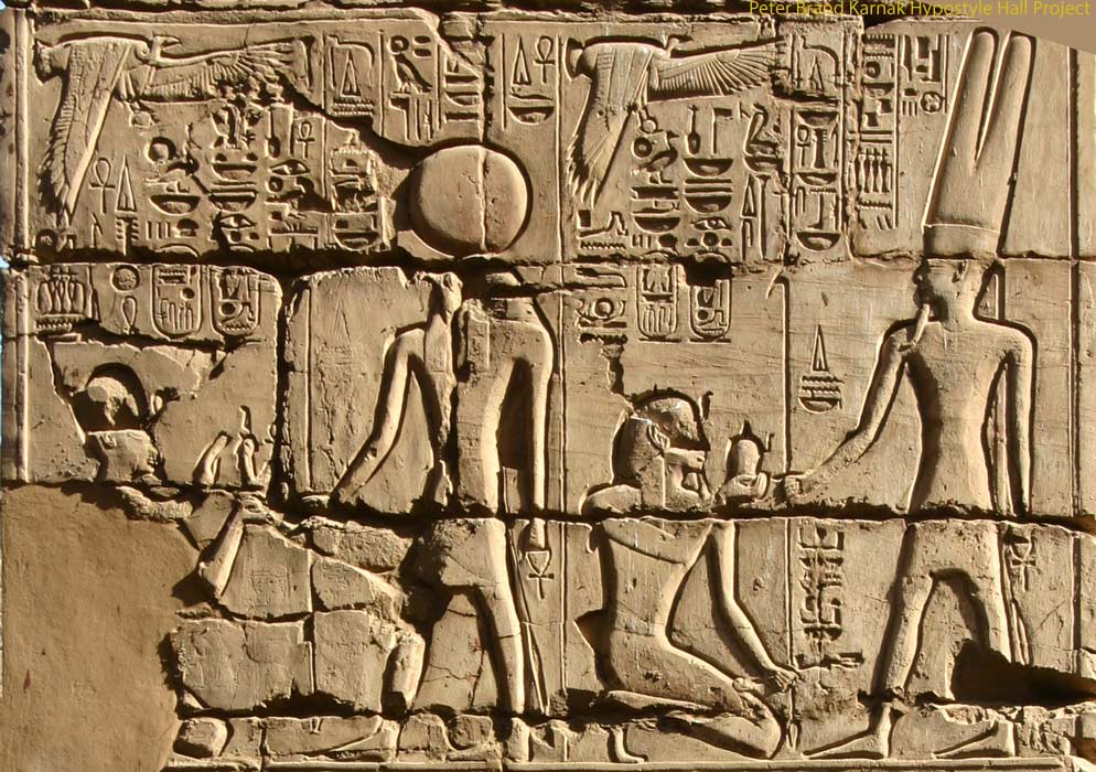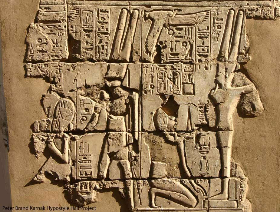 Scène 250 (gauche) : le roi Ramsès II, agenouillé (à l'origine Sethy 1er) encense Mout