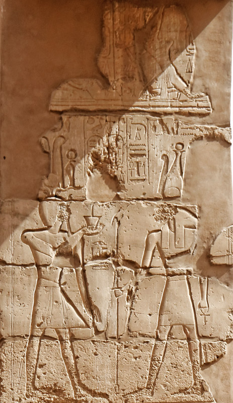 Scène 116 : le roi offre des fleurs et des laitues à Amon-Rê Kamoutef représenté ithyphallique. Le dieu est accompagné par Isis. Derrière le dieu, la formule de protection habituelle : "Que toute protection, toute vie, stabilité et pouvoir, toute santé et toute joie l'entoure comme Rê". Amon donne au roi toutes les terres plates pacifiées. Isis lui promet le Sud et le Nord, et toutes les contrées étrangères sous ses sandales.