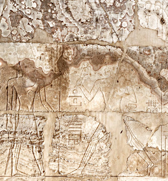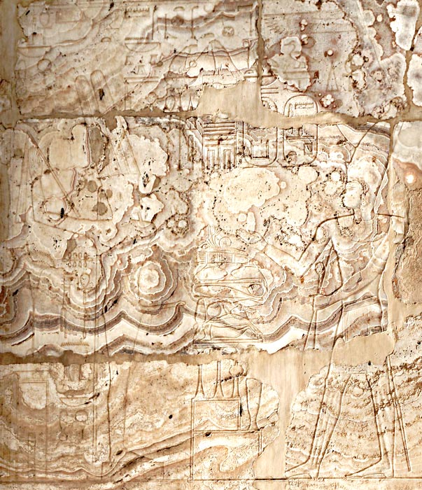 Le roi suivi de son kâ consacre à Amon-Min plusieurs veaux ainsi que des victuailles. Le dieu est suivi de sa chapelle sur laquelle est dressée une salade romaine, laitue oblongue qui lui est associée car sa sève blanchâtre, pareille à la semence est parée de vertus aphrodisiaques. Sa "perfection" est dressée. |