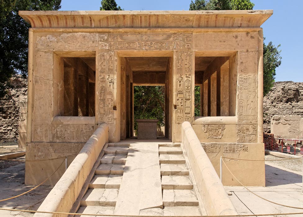Cette vue de face côté Est permet de voir l'enfilade des piliers à l'intérieur de la chapelle. L'encadrement de la porte comporte principalement les titulatures de Sésostris 1er, inscrites également sur l'architrave de chaque côté de l'encadrement de la porte.