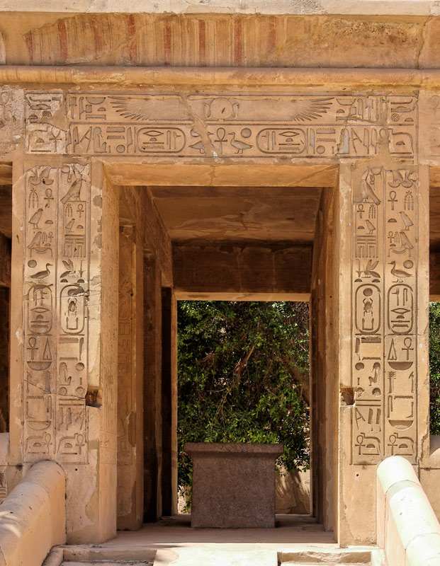 Tout en haut, celui de Behedet, au plumage bigarré, maître du ciel, étend ses ailes protectrices. Juste en dessous, une phrase : 'Vive le fils de Rê, Senousret, aimé d'Amon-Rê, qu'il vive éternellement".