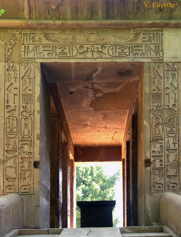 On retrouve la même décoration que sur la porte Est, à l'exception de l' épithète d'Amon-Rê qui est dit ici : Maître des trônes du Double Pays.