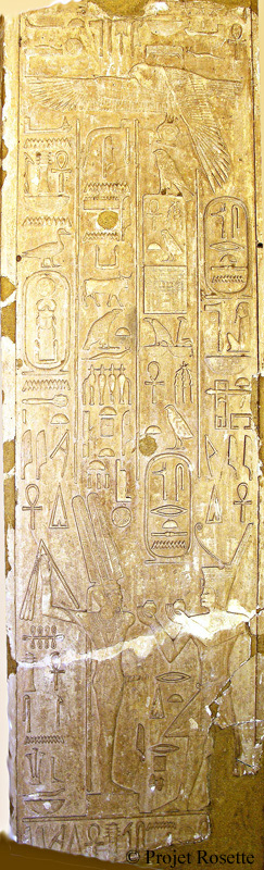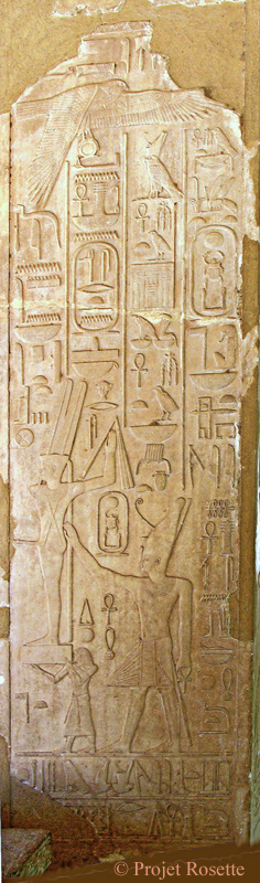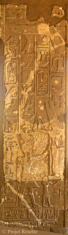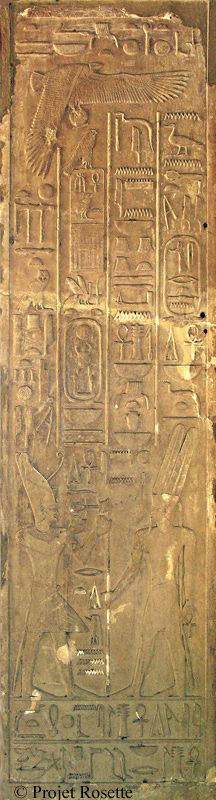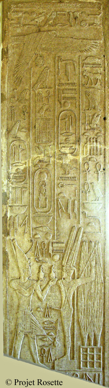 Le roi porte la couronne de Basse Égypte. Celui de Behedet plane au dessus de la scène. Derrière le dieu, une formule de protection : "Toute protection, vie, stabilité, santé avec lui".