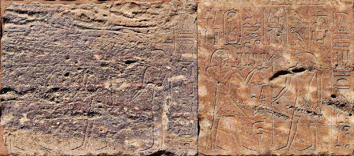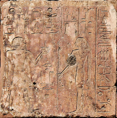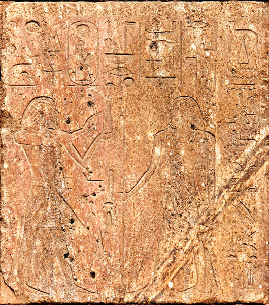 Scène 10 à gauche : Hatchepsout offre 2 vases à Seth et à Nephtys.. La surface du parpaing est en très mauvais état.