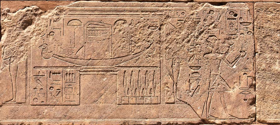 La barque est sur son reposoir à Karnak dans la Chapelle Rouge située dans le temple d'Amon. Cette scène se trouve sur l'assise 3 à l'extrémité du mur sud côté est. Toute la procession se déroule sur cette assise d'est en ouest.