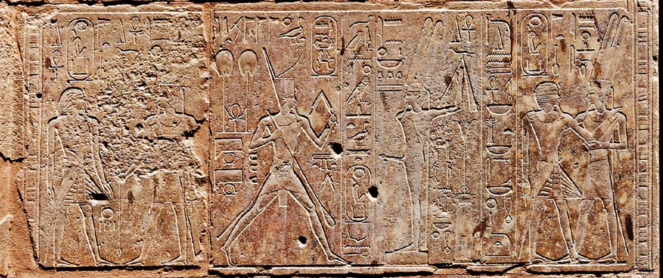 Assise 4 : Hatchepsout suivie de son ka consacre 4 veaux à Amon-Min. A droite, elle offre l'encens à Amon.